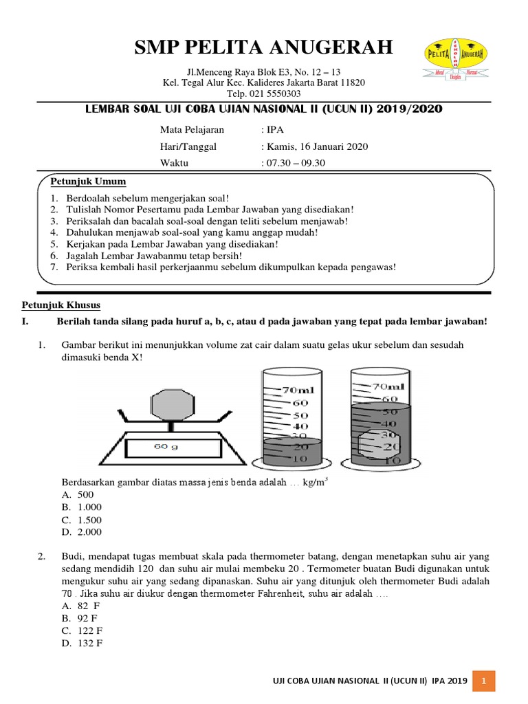 Download soal ucun dki jakarta tahun 2019 tahap 2 ipa. Silahkan download soal ucun di. Belajar dan berlatih dengan sungguh sungguh ialah belakang layar kesuksesan ujian nasional, apalagi untuk mata pelajaran ilmu pengetahuan alam (ipa). Ucun ipa smp siap un tahun 2020 ini terdiri dari 40 soal, berupa soal pilihan ganda. Perhatikan sifat fisis zat berikut!